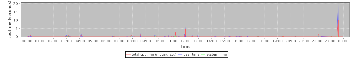 avg(mysqld) = 138.26 avg(mysqldump) = 2168.33 avg(zmmailboxd) = 574.60 avg(tripwire) = 954.61 avg(updatedb) = 52.00 avg(netstat) = 17.00 avg(java) = 637.57 avg(gzip) = 2502.75 avg(puppetd) = 18.17 avg(zmcompresslogs) = 1701.86