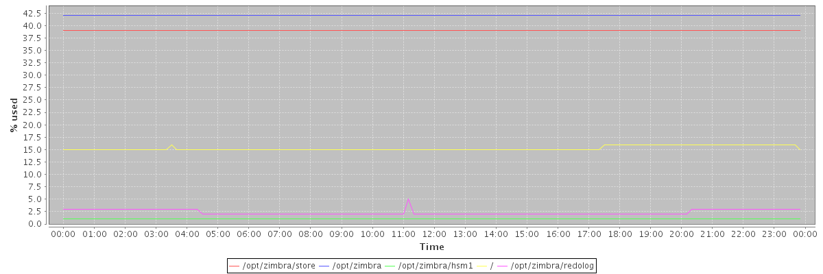 avg(/opt/zimbra/store) = 39.00 avg(/opt/zimbra) = 42.00 avg(/opt/zimbra/hsm1) = 1.00 avg(/) = 15.27 avg(/opt/zimbra/redolog) = 2.36