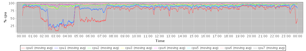 avg(cpu0) = 72.62 avg(cpu1) = 83.34 avg(cpu2) = 94.54 avg(cpu3) = 94.85 avg(cpu4) = 97.04 avg(cpu5) = 85.21 avg(cpu6) = 98.27 avg(cpu7) = 97.79