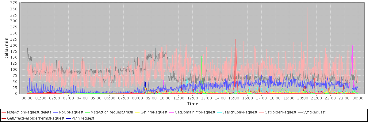 max(MsgActionRequest.delete) = 226.00 max(NoOpRequest) = 91.00 max(MsgActionRequest.trash) = 156.00 max(GetInfoRequest) = 111.00 max(GetDomainInfoRequest) = 198.00 max(SearchConvRequest) = 84.00 max(GetFolderRequest) = 359.00 max(SyncRequest) = 198.00 max(GetEffectiveFolderPermsRequest) = 88.00 max(AuthRequest) = 110.00