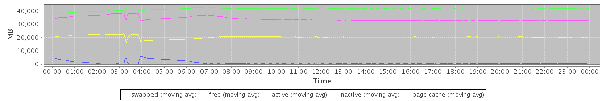 avg(swapped) = 0.29 avg(free) = 933.66 avg(active) = 41487.35 avg(inactive) = 20320.47 avg(page cache) = 34022.47