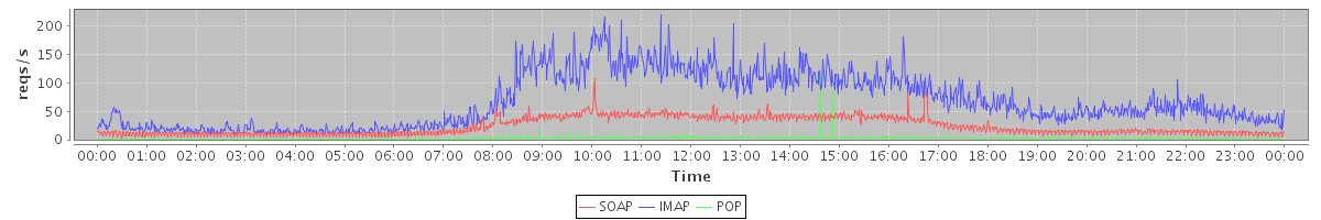 Host zm04.stanford.edu: Mailboxd: Request Rate by Client Protocol