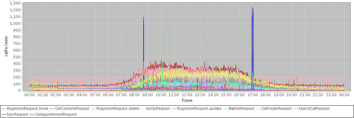 max(MsgActionRequest.move) = 326.00 max(GetContactsRequest) = 1251.00 max(MsgActionRequest.delete) = 1027.00 max(NoOpRequest) = 359.00 max(MsgActionRequest.update) = 457.00 max(WaitSetRequest) = 185.00 max(GetFolderRequest) = 434.00 max(SearchGalRequest) = 366.00 max(SyncRequest) = 461.00 max(GetAppointmentRequest) = 1221.00