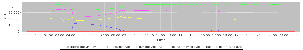 avg(swapped) = 1.25 avg(free) = 2119.48 avg(active) = 40816.48 avg(inactive) = 19914.30 avg(page cache) = 31470.89