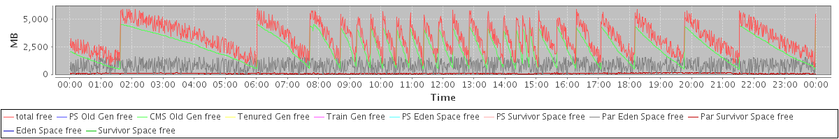 avg(total free) = 3287.91 avg(PS Old Gen free) = 0.00 avg(CMS Old Gen free) = 2401.06 avg(Tenured Gen free) = 0.00 avg(Train Gen free) = 0.00 avg(PS Eden Space free) = 0.00 avg(PS Survivor Space free) = 0.00 avg(Par Eden Space free) = 805.17 avg(Par Survivor Space free) = 81.67 avg(Eden Space free) = 0.00 avg(Survivor Space free) = 0.00