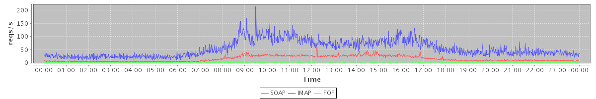 Host zm03.stanford.edu: Mailboxd: Request Rate by Client Protocol