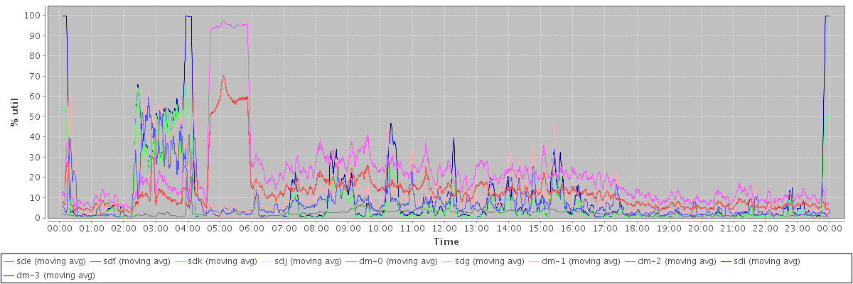avg(sde) = 13.41 avg(sdf) = 8.28 avg(sdk) = 6.83 avg(sdj) = 8.28 avg(dm-0) = 21.89 avg(sdg) = 6.83 avg(dm-1) = 11.41 avg(dm-2) = 2.54 avg(sdi) = 13.40 avg(dm-3) = 9.95