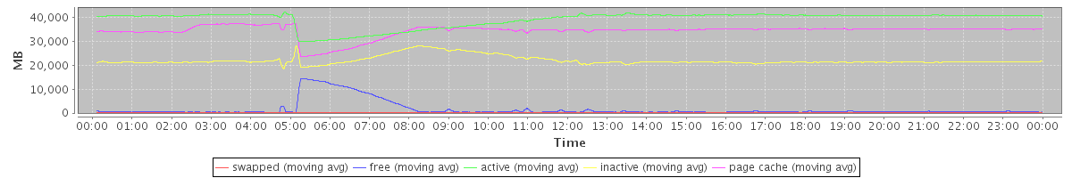 avg(swapped) = 5.35 avg(free) = 1573.88 avg(active) = 39162.98 avg(inactive) = 22008.71 avg(page cache) = 34328.30
