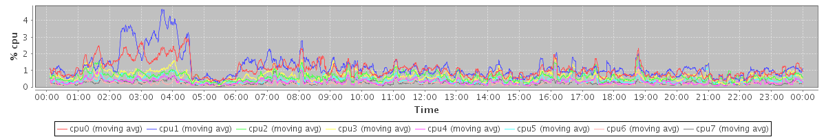 avg(cpu0) = 1.04 avg(cpu1) = 1.20 avg(cpu2) = 0.61 avg(cpu3) = 0.66 avg(cpu4) = 0.34 avg(cpu5) = 0.42 avg(cpu6) = 0.24 avg(cpu7) = 0.27