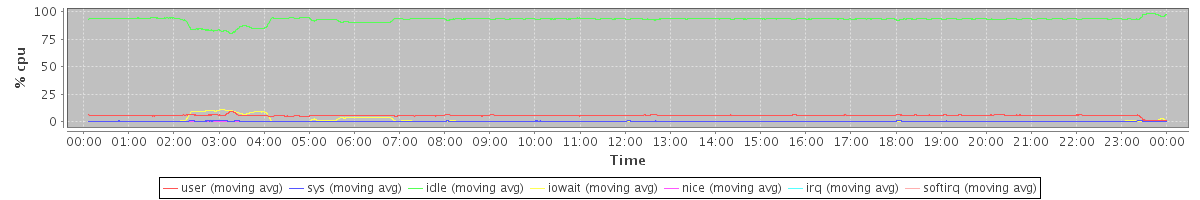 avg(user) = 5.44 avg(sys) = 0.27 avg(idle) = 93.03 avg(iowait) = 1.12 avg(nice) = 0.11 avg(irq) = 0.00 avg(softirq) = 0.01