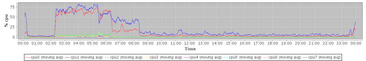 avg(cpu0) = 1.09 avg(cpu1) = 0.93 avg(cpu2) = 0.54 avg(cpu3) = 0.47 avg(cpu4) = 0.38 avg(cpu5) = 0.31 avg(cpu6) = 0.27 avg(cpu7) = 0.25