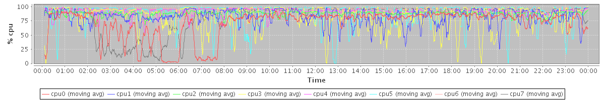 avg(cpu0) = 71.13 avg(cpu1) = 81.82 avg(cpu2) = 87.75 avg(cpu3) = 80.89 avg(cpu4) = 91.17 avg(cpu5) = 85.83 avg(cpu6) = 94.22 avg(cpu7) = 81.53