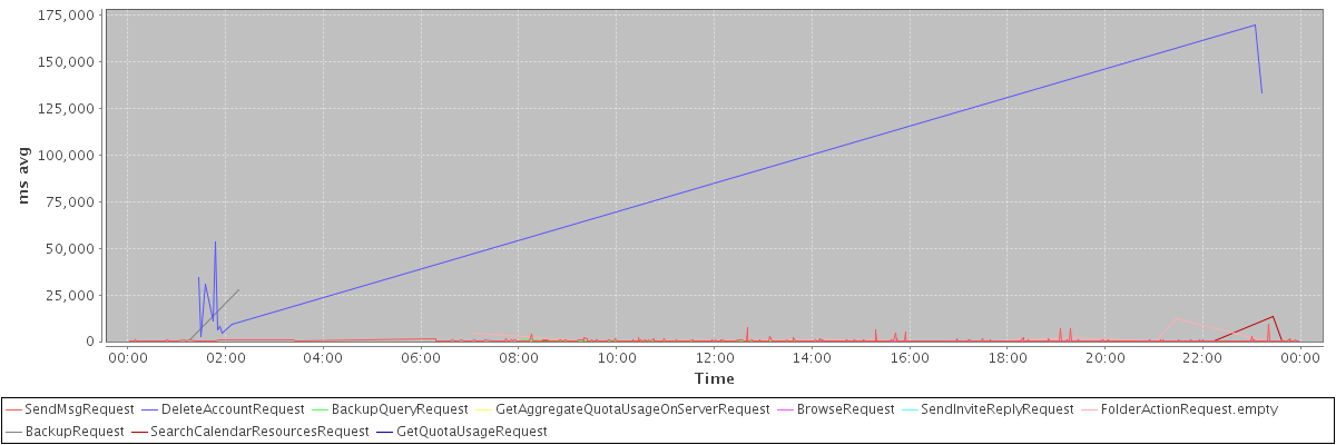avg(SendMsgRequest) = 375.41 avg(DeleteAccountRequest) = 42238.64 avg(BackupQueryRequest) = 252.40 avg(GetAggregateQuotaUsageOnServerRequest) = 1959.00 avg(BrowseRequest) = 231.75 avg(SendInviteReplyRequest) = 286.75 avg(FolderActionRequest.empty) = 1560.86 avg(BackupRequest) = 14269.00 avg(SearchCalendarResourcesRequest) = 623.14 avg(GetQuotaUsageRequest) = 3131.00