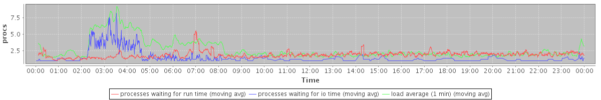 avg(processes waiting for run time) = 1.91 avg(processes waiting for io time) = 0.72 avg(load average (1 min)) = 2.66