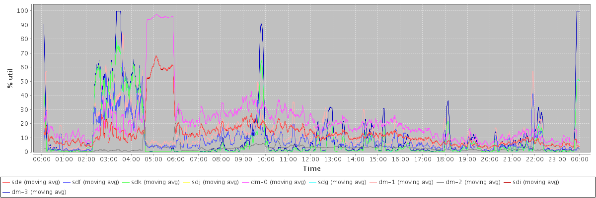 avg(sde) = 13.47 avg(sdf) = 9.14 avg(sdk) = 8.13 avg(sdj) = 9.13 avg(dm-0) = 22.09 avg(sdg) = 8.14 avg(dm-1) = 12.56 avg(dm-2) = 2.68 avg(sdi) = 13.46 avg(dm-3) = 11.05