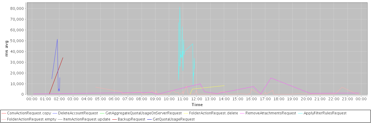 avg(ConvActionRequest.copy) = 2356.00 avg(DeleteAccountRequest) = 15519.83 avg(GetAggregateQuotaUsageOnServerRequest) = 3171.00 avg(FolderActionRequest.delete) = 4477.67 avg(RemoveAttachmentsRequest) = 2860.53 avg(ApplyFilterRulesRequest) = 35792.21 avg(FolderActionRequest.empty) = 1143.83 avg(ItemActionRequest.update) = 721.00 avg(BackupRequest) = 17279.00 avg(GetQuotaUsageRequest) = 3364.00