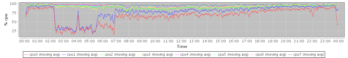 avg(cpu0) = 1.64 avg(cpu1) = 1.49 avg(cpu2) = 1.10 avg(cpu3) = 1.04 avg(cpu4) = 0.73 avg(cpu5) = 0.74 avg(cpu6) = 0.46 avg(cpu7) = 0.41