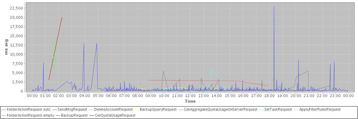 avg(FolderActionRequest.sync) = 2182.75 avg(SendMsgRequest) = 450.84 avg(DeleteAccountRequest) = 10922.67 avg(BackupQueryRequest) = 576.17 avg(GetAggregateQuotaUsageOnServerRequest) = 1654.00 avg(SetTaskRequest) = 593.23 avg(ApplyFilterRulesRequest) = 2560.50 avg(FolderActionRequest.empty) = 806.72 avg(BackupRequest) = 11536.50 avg(GetQuotaUsageRequest) = 2701.00