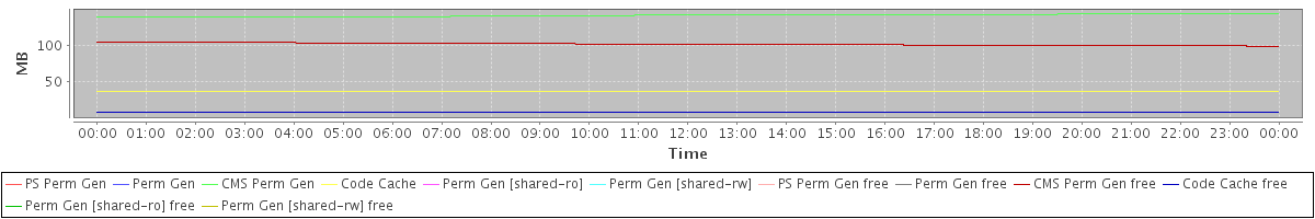 avg(PS Perm Gen) = 0.00 avg(Perm Gen) = 0.00 avg(CMS Perm Gen) = 140.02 avg(Code Cache) = 37.58 avg(Perm Gen [shared-ro]) = 0.00 avg(Perm Gen [shared-rw]) = 0.00 avg(PS Perm Gen free) = 0.00 avg(Perm Gen free) = 0.00 avg(CMS Perm Gen free) = 101.13 avg(Code Cache free) = 9.17 avg(Perm Gen [shared-ro] free) = 0.00 avg(Perm Gen [shared-rw] free) = 0.00