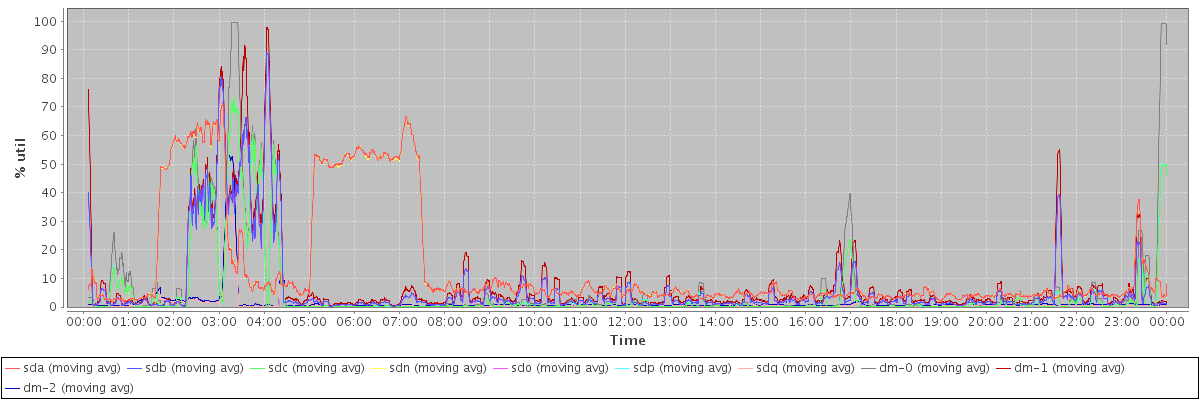 avg(sda) = 13.82 avg(sdb) = 6.56 avg(sdc) = 4.68 avg(sdn) = 13.80 avg(sdo) = 6.56 avg(sdp) = 4.67 avg(sdq) = 0.84 avg(dm-0) = 6.24 avg(dm-1) = 8.31 avg(dm-2) = 1.37