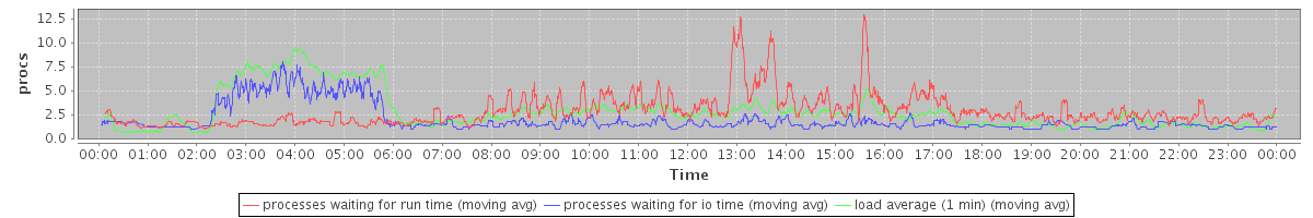 avg(processes waiting for run time) = 2.43 avg(processes waiting for io time) = 1.29 avg(load average (1 min)) = 2.82