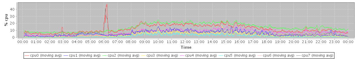 avg(cpu0) = 22.14 avg(cpu1) = 1.01 avg(cpu2) = 0.65 avg(cpu3) = 0.40 avg(cpu4) = 0.62 avg(cpu5) = 0.21 avg(cpu6) = 0.30 avg(cpu7) = 16.87