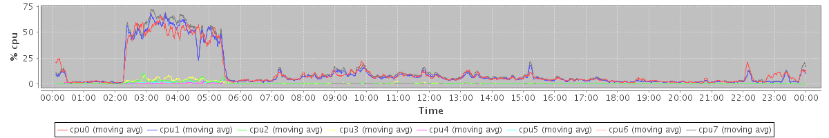 avg(cpu0) = 11.48 avg(cpu1) = 11.04 avg(cpu2) = 0.63 avg(cpu3) = 0.75 avg(cpu4) = 0.19 avg(cpu5) = 0.28 avg(cpu6) = 0.08 avg(cpu7) = 12.27