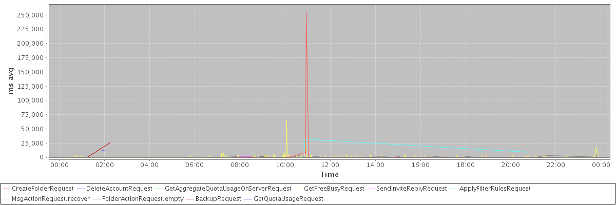 avg(CreateFolderRequest) = 4793.29 avg(DeleteAccountRequest) = 12195.50 avg(GetAggregateQuotaUsageOnServerRequest) = 2688.00 avg(GetFreeBusyRequest) = 499.97 avg(SendInviteReplyRequest) = 488.92 avg(ApplyFilterRulesRequest) = 10315.78 avg(MsgActionRequest.recover) = 1850.78 avg(FolderActionRequest.empty) = 668.26 avg(BackupRequest) = 13251.00 avg(GetQuotaUsageRequest) = 4421.00