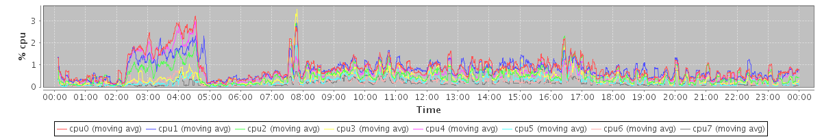 avg(cpu0) = 0.10 avg(cpu1) = 0.13 avg(cpu2) = 0.08 avg(cpu3) = 0.05 avg(cpu4) = 0.07 avg(cpu5) = 0.03 avg(cpu6) = 0.01 avg(cpu7) = 0.01