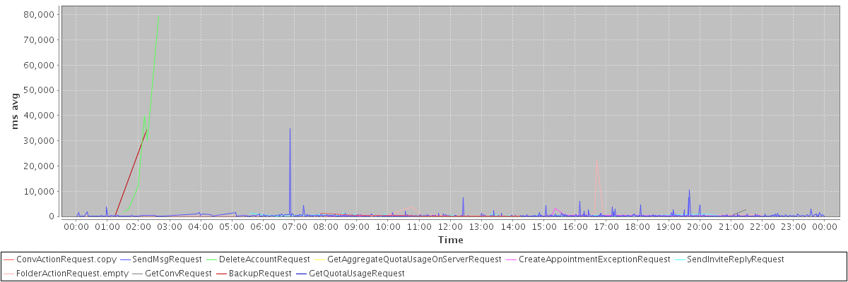 avg(ConvActionRequest.copy) = 348.38 avg(SendMsgRequest) = 384.05 avg(DeleteAccountRequest) = 24213.00 avg(GetAggregateQuotaUsageOnServerRequest) = 1487.00 avg(CreateAppointmentExceptionRequest) = 360.11 avg(SendInviteReplyRequest) = 327.37 avg(FolderActionRequest.empty) = 1359.26 avg(GetConvRequest) = 701.50 avg(BackupRequest) = 17509.50 avg(GetQuotaUsageRequest) = 2417.00