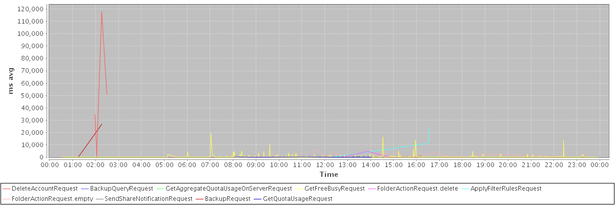 avg(DeleteAccountRequest) = 51021.75 avg(BackupQueryRequest) = 375.00 avg(GetAggregateQuotaUsageOnServerRequest) = 3136.00 avg(GetFreeBusyRequest) = 375.16 avg(FolderActionRequest.delete) = 1411.25 avg(ApplyFilterRulesRequest) = 11611.00 avg(FolderActionRequest.empty) = 1023.17 avg(SendShareNotificationRequest) = 485.40 avg(BackupRequest) = 13651.50 avg(GetQuotaUsageRequest) = 4262.00
