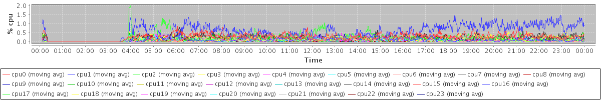avg(cpu0) = 0.16 avg(cpu1) = 0.18 avg(cpu2) = 0.10 avg(cpu3) = 0.07 avg(cpu4) = 0.07 avg(cpu5) = 0.04 avg(cpu6) = 0.04 avg(cpu7) = 0.03 avg(cpu8) = 0.03 avg(cpu9) = 0.01 avg(cpu10) = 0.09 avg(cpu11) = 0.01 avg(cpu12) = 0.03 avg(cpu13) = 0.02 avg(cpu14) = 0.06 avg(cpu15) = 0.05 avg(cpu16) = 0.04 avg(cpu17) = 0.04 avg(cpu18) = 0.06 avg(cpu19) = 0.04 avg(cpu20) = 0.05 avg(cpu21) = 0.00 avg(cpu22) = 0.01 avg(cpu23) = 0.00