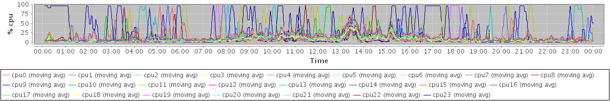 avg(cpu0) = 1.33 avg(cpu1) = 1.14 avg(cpu2) = 0.81 avg(cpu3) = 0.63 avg(cpu4) = 0.61 avg(cpu5) = 0.53 avg(cpu6) = 0.47 avg(cpu7) = 0.38 avg(cpu8) = 0.37 avg(cpu9) = 0.88 avg(cpu10) = 0.95 avg(cpu11) = 0.62 avg(cpu12) = 0.48 avg(cpu13) = 0.67 avg(cpu14) = 0.97 avg(cpu15) = 0.93 avg(cpu16) = 0.72 avg(cpu17) = 0.57 avg(cpu18) = 0.51 avg(cpu19) = 0.53 avg(cpu20) = 0.53 avg(cpu21) = 0.96 avg(cpu22) = 0.46 avg(cpu23) = 0.64