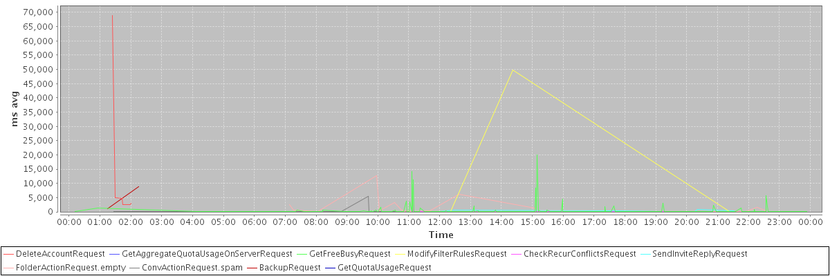 avg(DeleteAccountRequest) = 14446.83 avg(GetAggregateQuotaUsageOnServerRequest) = 1817.00 avg(GetFreeBusyRequest) = 355.42 avg(ModifyFilterRulesRequest) = 16606.00 avg(CheckRecurConflictsRequest) = 1430.00 avg(SendInviteReplyRequest) = 347.12 avg(FolderActionRequest.empty) = 1169.82 avg(ConvActionRequest.spam) = 565.50 avg(BackupRequest) = 5040.50 avg(GetQuotaUsageRequest) = 1625.00