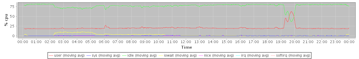 avg(user) = 20.39 avg(sys) = 0.40 avg(idle) = 76.89 avg(iowait) = 2.26 avg(nice) = 0.00 avg(irq) = 0.00 avg(softirq) = 0.05