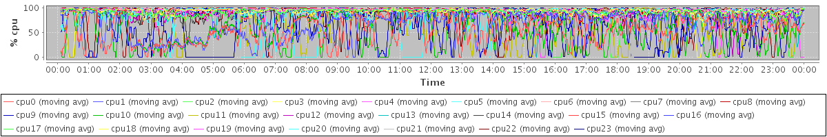 avg(cpu0) = 1.21 avg(cpu1) = 0.84 avg(cpu2) = 0.51 avg(cpu3) = 0.43 avg(cpu4) = 0.37 avg(cpu5) = 0.35 avg(cpu6) = 0.28 avg(cpu7) = 0.24 avg(cpu8) = 0.20 avg(cpu9) = 0.22 avg(cpu10) = 1.15 avg(cpu11) = 0.36 avg(cpu12) = 0.32 avg(cpu13) = 0.42 avg(cpu14) = 0.80 avg(cpu15) = 0.83 avg(cpu16) = 0.61 avg(cpu17) = 0.61 avg(cpu18) = 0.40 avg(cpu19) = 0.40 avg(cpu20) = 0.67 avg(cpu21) = 0.10 avg(cpu22) = 0.48 avg(cpu23) = 0.49