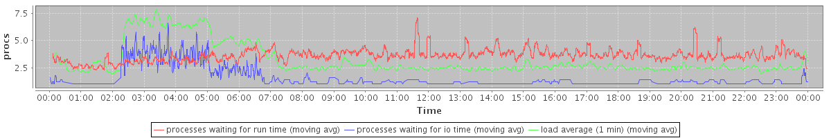 avg(processes waiting for run time) = 3.63 avg(processes waiting for io time) = 0.79 avg(load average (1 min)) = 3.20