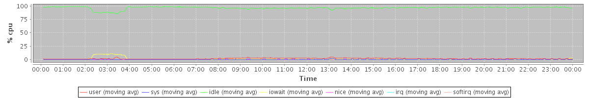 avg(user) = 1.88 avg(sys) = 0.38 avg(idle) = 96.62 avg(iowait) = 1.09 avg(nice) = 0.00 avg(irq) = 0.00 avg(softirq) = 0.02