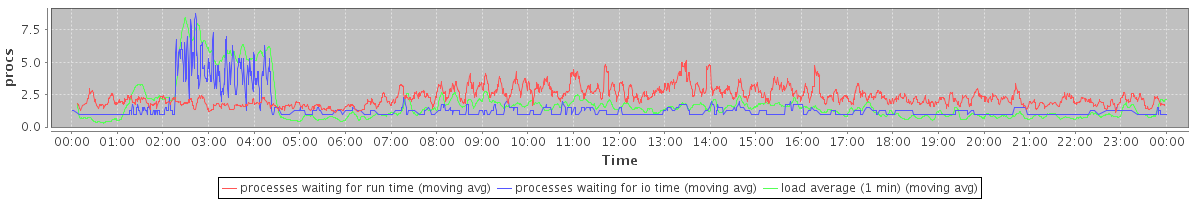 avg(processes waiting for run time) = 1.92 avg(processes waiting for io time) = 0.68 avg(load average (1 min)) = 1.73