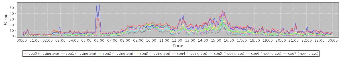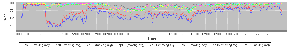 avg(cpu0) = 13.39 avg(cpu1) = 22.29 avg(cpu2) = 0.84 avg(cpu3) = 0.62 avg(cpu4) = 0.34 avg(cpu5) = 0.34 avg(cpu6) = 0.17 avg(cpu7) = 0.17