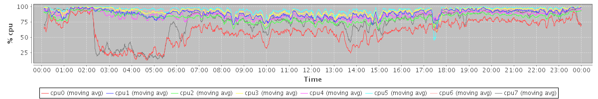 avg(cpu0) = 59.60 avg(cpu1) = 88.82 avg(cpu2) = 82.14 avg(cpu3) = 92.02 avg(cpu4) = 86.01 avg(cpu5) = 94.85 avg(cpu6) = 90.83 avg(cpu7) = 73.78