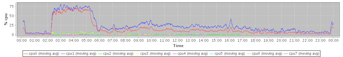 avg(cpu0) = 15.61 avg(cpu1) = 23.99 avg(cpu2) = 1.01 avg(cpu3) = 0.89 avg(cpu4) = 0.38 avg(cpu5) = 0.51 avg(cpu6) = 0.17 avg(cpu7) = 0.25