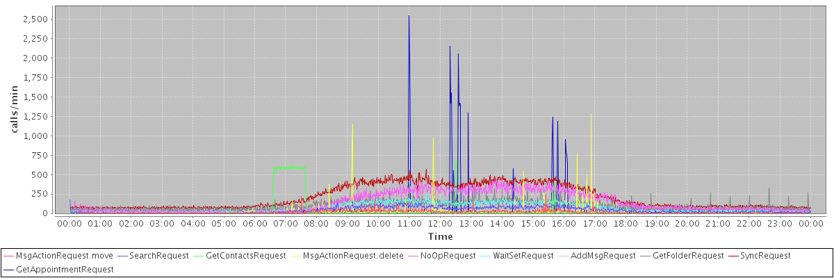 max(MsgActionRequest.move) = 243.00 max(SearchRequest) = 178.00 max(GetContactsRequest) = 685.00 max(MsgActionRequest.delete) = 1283.00 max(NoOpRequest) = 462.00 max(WaitSetRequest) = 240.00 max(AddMsgRequest) = 240.00 max(GetFolderRequest) = 383.00 max(SyncRequest) = 568.00 max(GetAppointmentRequest) = 2548.00