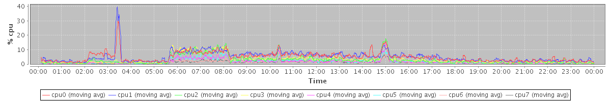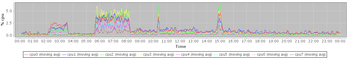 avg(cpu0) = 5.37 avg(cpu1) = 7.94 avg(cpu2) = 0.37 avg(cpu3) = 0.18 avg(cpu4) = 0.11 avg(cpu5) = 0.06 avg(cpu6) = 0.04 avg(cpu7) = 0.02