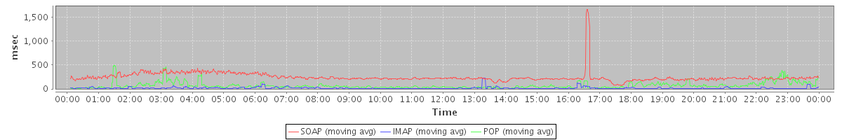 avg(FolderActionRequest.sync) = 2078.00 avg(DeleteAccountRequest) = 33797.50 avg(GetAggregateQuotaUsageOnServerRequest) = 1653.00 avg(FolderActionRequest.delete) = 2486.00 avg(ApplyFilterRulesRequest) = 6817.20 avg(BounceMsgRequest) = 945.00 avg(FolderActionRequest.empty) = 690.50 avg(SendShareNotificationRequest) = 416.75 avg(BackupRequest) = 3876.50 avg(GetQuotaUsageRequest) = 1667.00
