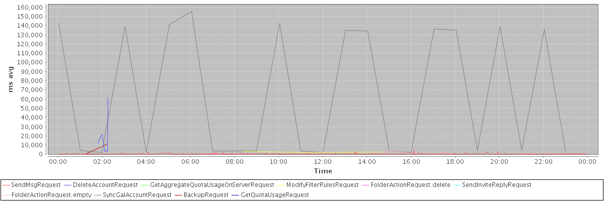 avg(SendMsgRequest) = 308.77 avg(DeleteAccountRequest) = 20443.00 avg(GetAggregateQuotaUsageOnServerRequest) = 1559.00 avg(ModifyFilterRulesRequest) = 2229.25 avg(FolderActionRequest.delete) = 3853.00 avg(SendInviteReplyRequest) = 337.67 avg(FolderActionRequest.empty) = 394.19 avg(SyncGalAccountRequest) = 65743.88 avg(BackupRequest) = 5684.50 avg(GetQuotaUsageRequest) = 1642.00
