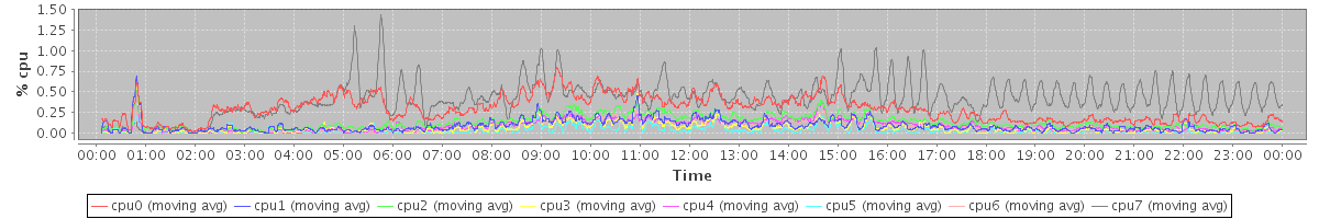 avg(cpu0) = 1.29 avg(cpu1) = 0.75 avg(cpu2) = 0.76 avg(cpu3) = 0.50 avg(cpu4) = 0.58 avg(cpu5) = 0.33 avg(cpu6) = 0.47 avg(cpu7) = 1.24
