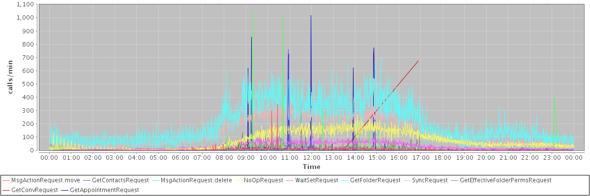 max(MsgActionRequest.move) = 348.00 max(GetContactsRequest) = 761.00 max(MsgActionRequest.delete) = 1051.00 max(NoOpRequest) = 266.00 max(WaitSetRequest) = 116.00 max(GetFolderRequest) = 702.00 max(SyncRequest) = 368.00 max(GetEffectiveFolderPermsRequest) = 375.00 max(GetConvRequest) = 675.00 max(GetAppointmentRequest) = 1016.00