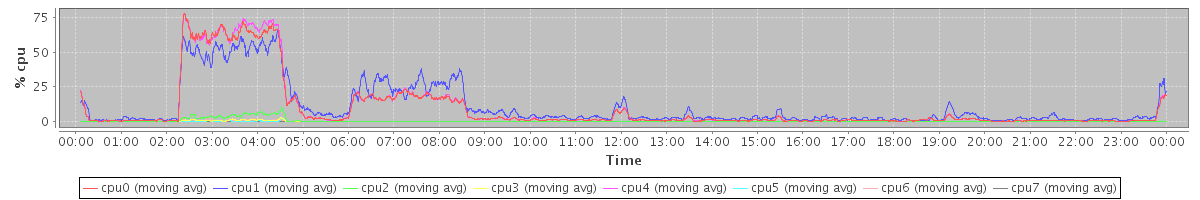 avg(cpu0) = 2.77 avg(cpu1) = 3.44 avg(cpu2) = 1.08 avg(cpu3) = 1.28 avg(cpu4) = 1.99 avg(cpu5) = 0.70 avg(cpu6) = 0.48 avg(cpu7) = 0.57