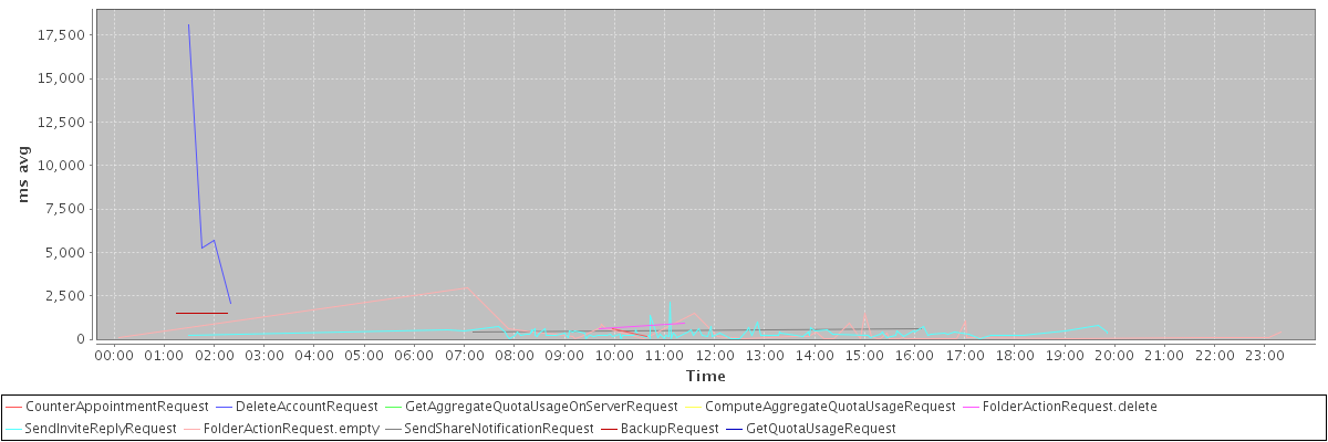 avg(CounterAppointmentRequest) = 384.50 avg(DeleteAccountRequest) = 7780.25 avg(GetAggregateQuotaUsageOnServerRequest) = 1167.00 avg(ComputeAggregateQuotaUsageRequest) = 2038.00 avg(FolderActionRequest.delete) = 759.00 avg(SendInviteReplyRequest) = 323.61 avg(FolderActionRequest.empty) = 327.28 avg(SendShareNotificationRequest) = 514.50 avg(BackupRequest) = 1487.00 avg(GetQuotaUsageRequest) = 1233.00